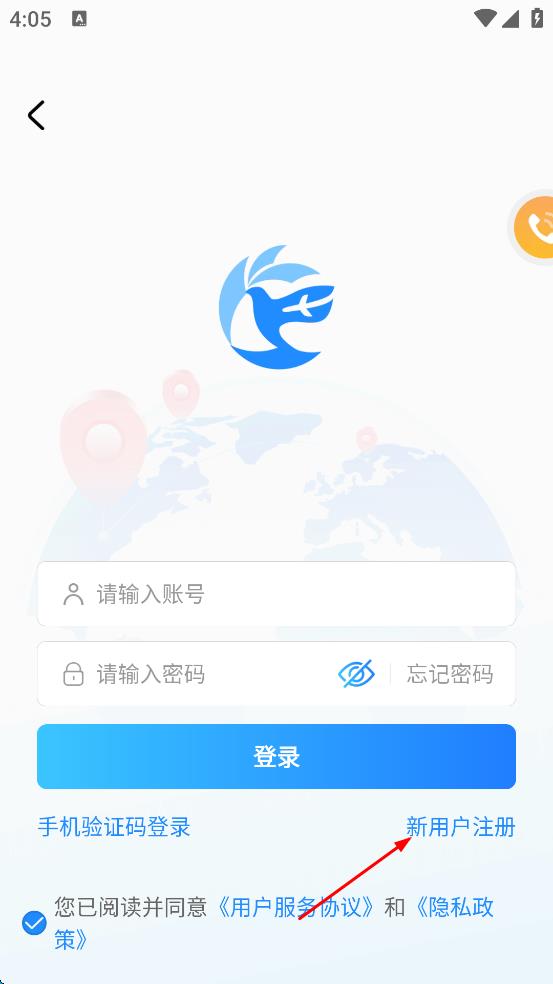 1、打開某出行類APP,進(jìn)入登錄頁面后,點(diǎn)擊“新用戶注冊”選項(xiàng)。
