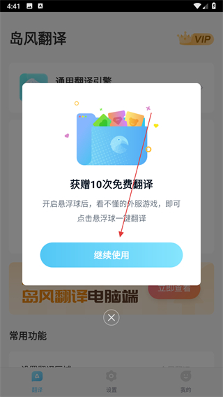 2、在彈出的獲贈10次免費翻譯窗口中,點擊繼續(xù)使用按鈕。