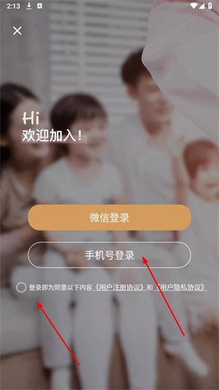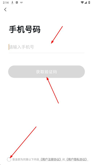 2、在登錄頁面,選擇手機號登錄,并勾選用戶協(xié)議和用戶隱私協(xié)議。