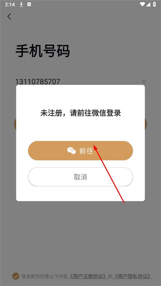 3、輸入手機號碼,輸入收到的驗證碼,提示未注冊,點擊前往微信登錄。
