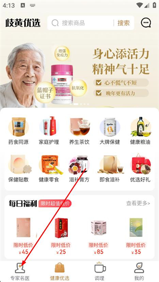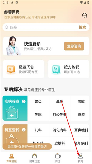1、打開歧黃醫(yī)官APP,點擊底部導航欄專家名醫(yī)選項。
