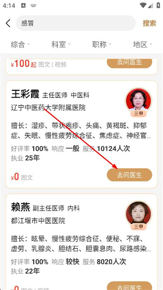 4、選擇醫(yī)生,點擊去問醫(yī)生按鈕,即可發(fā)起咨詢。