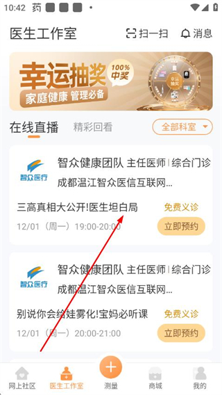 2、在醫(yī)生工作室頁面的在線直播板塊,選擇目標(biāo)直播,點(diǎn)擊進(jìn)入直播詳情頁。