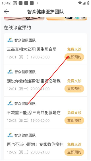 3、在直播詳情頁點(diǎn)擊對應(yīng)直播右側(cè)的立即預(yù)約,進(jìn)入預(yù)約在線診室頁面。