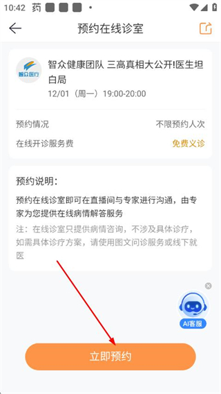 4、在預(yù)約在線診室頁面點(diǎn)擊底部的立即預(yù)約按鈕,完成直播預(yù)約操作。