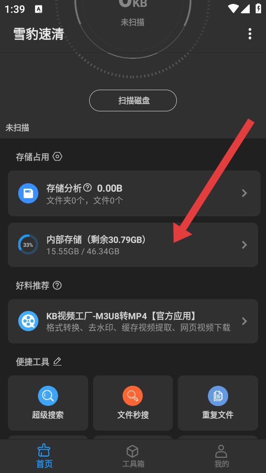 1、打開雪豹速清APP的首頁,然后點(diǎn)擊內(nèi)部存儲,進(jìn)入設(shè)備存儲文件的目錄。