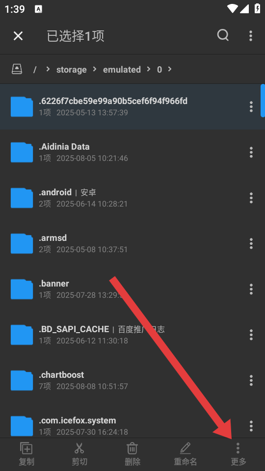 2、在文件列表中,長按選中需要進(jìn)行移動的文件,點(diǎn)擊底部功能欄的更多,調(diào)出操作菜單。