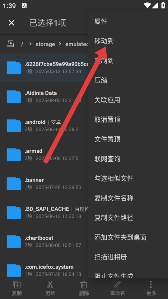 3、在彈出的菜單選項里,選擇移動到,即可指定目標(biāo)路徑完成文件轉(zhuǎn)移的操作。