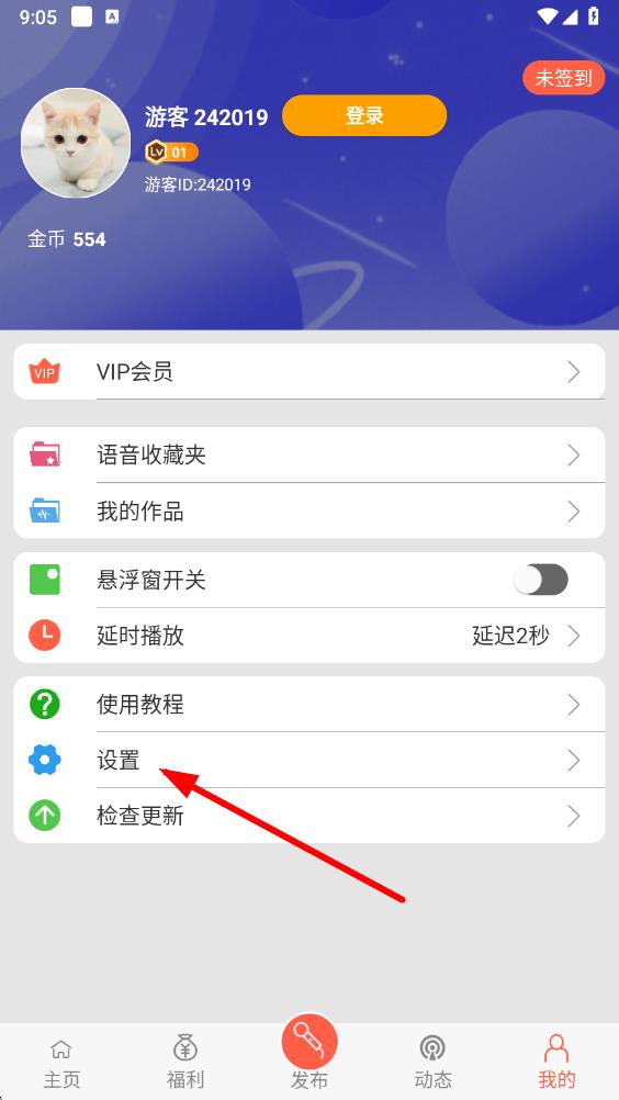 2、在我的頁(yè)面里,找到并點(diǎn)擊設(shè)置選項(xiàng),準(zhǔn)備對(duì)軟件相關(guān)功能進(jìn)行設(shè)置。