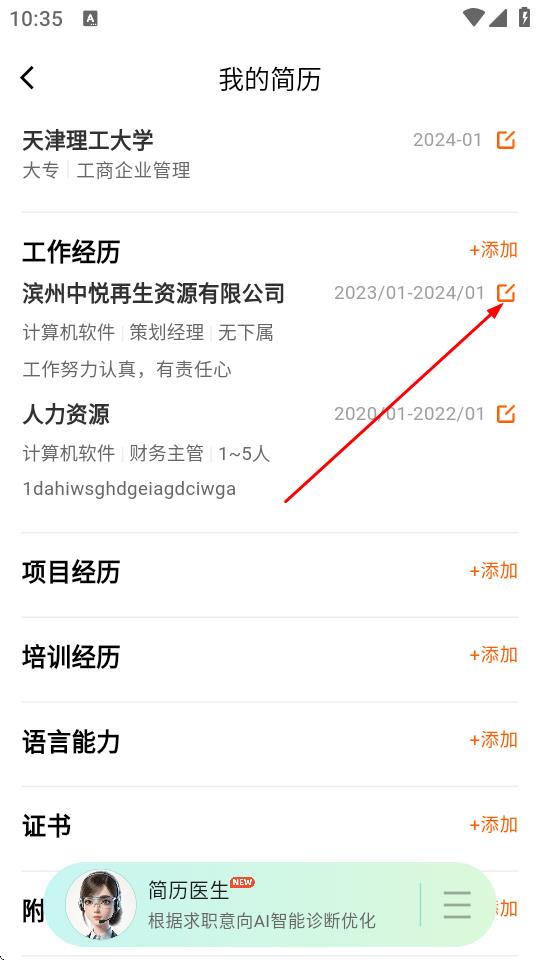 3、進(jìn)入我的簡歷頁面后,找到需要刪除的工作經(jīng)歷,點(diǎn)擊編輯圖標(biāo)。