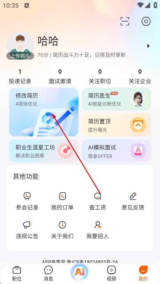 2、在我的頁面,點(diǎn)擊修改簡歷選項(xiàng)。