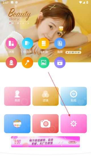 1、打開美顏輕拍相機APP,在主界面點擊粉色齒輪形狀的設置按鈕,進入設置相關頁面。
