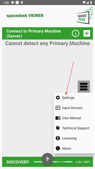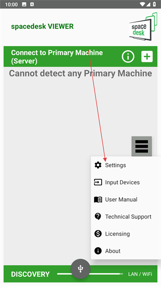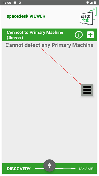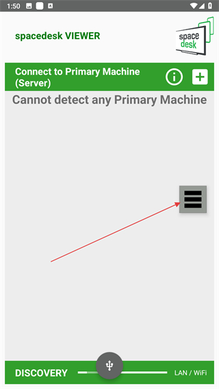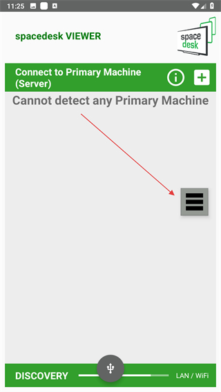 1、打開(kāi)spacedesk VIEWER應(yīng)用,界面右側(cè)有三橫線菜單按鈕,點(diǎn)擊該按鈕。