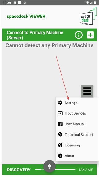 1、打開(kāi)spacedesk應(yīng)用,點(diǎn)擊三條橫線圖標(biāo)。