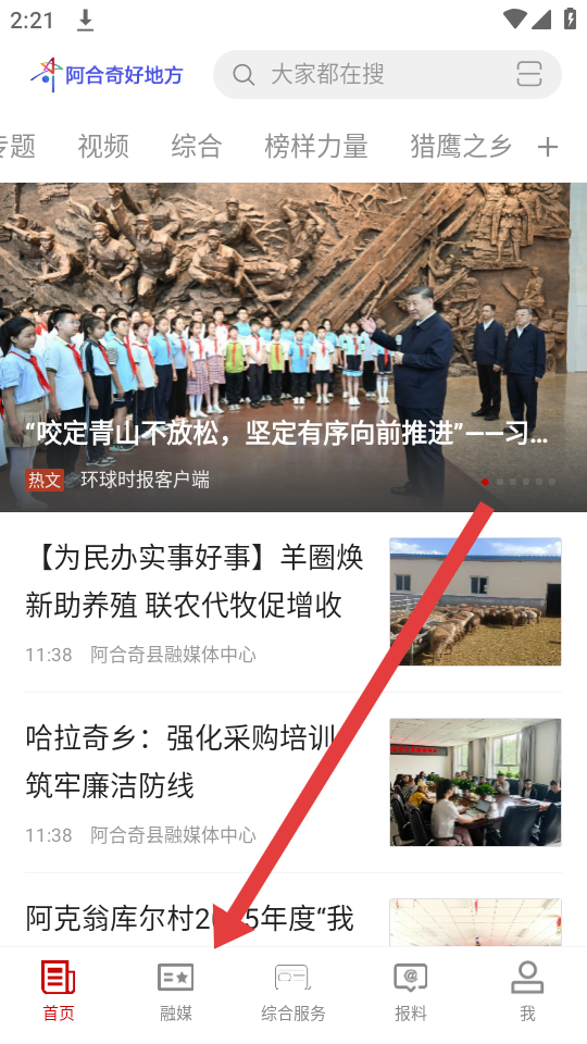 1、打開阿合奇好地方app,在首頁底部導(dǎo)航欄中,點擊融媒按鈕,進(jìn)入融媒相關(guān)界面,這是收聽廣播的起始步驟。