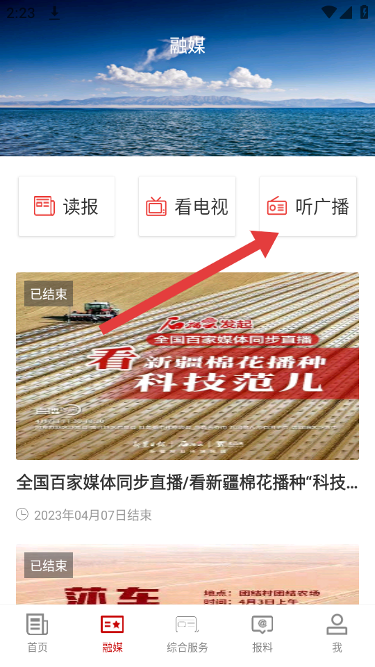 2、進(jìn)入融媒的界面后,在上方功能區(qū)域找到并點擊聽廣播選項,從而進(jìn)入廣播頻率的選擇頁面。