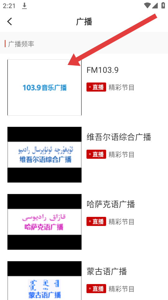 3、在廣播頻率選擇頁面,瀏覽各類廣播選項,如FM103.9音樂廣播,點擊想要收聽的廣播,即可開始收聽對應(yīng)的直播節(jié)目。
