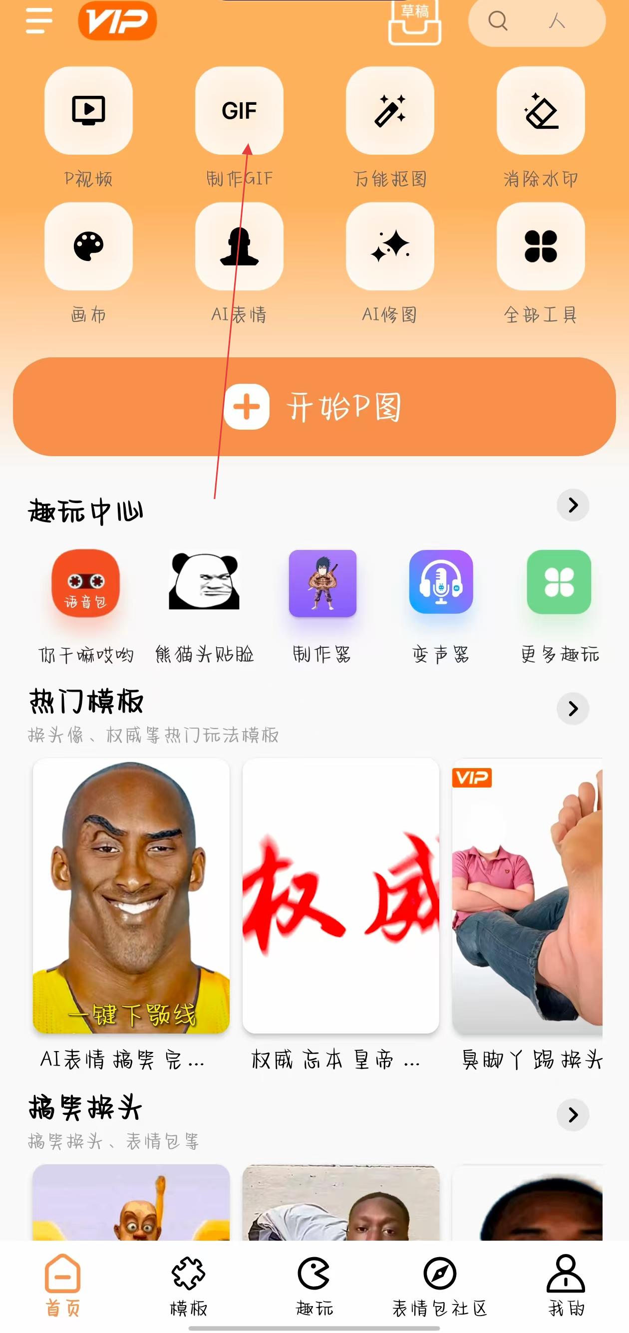 1、打開暴走P圖應(yīng)用進入首頁,點擊頁面上方的制作GIF按鈕,進入GIF制作素材選擇界面。
