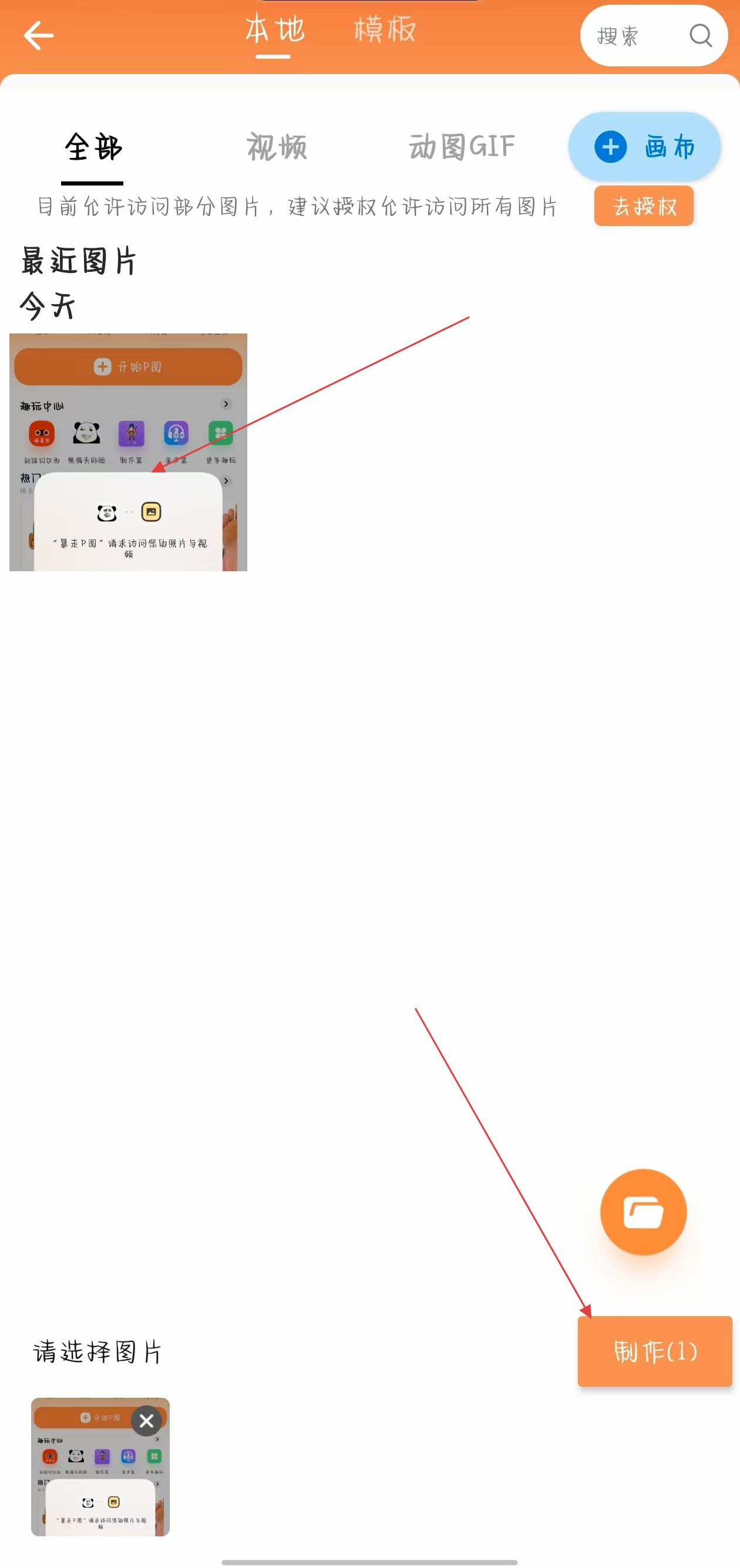 2、在素材選擇界面,點擊本地選項卡下的圖片進行選取,選好后點擊右下角制作按鈕。