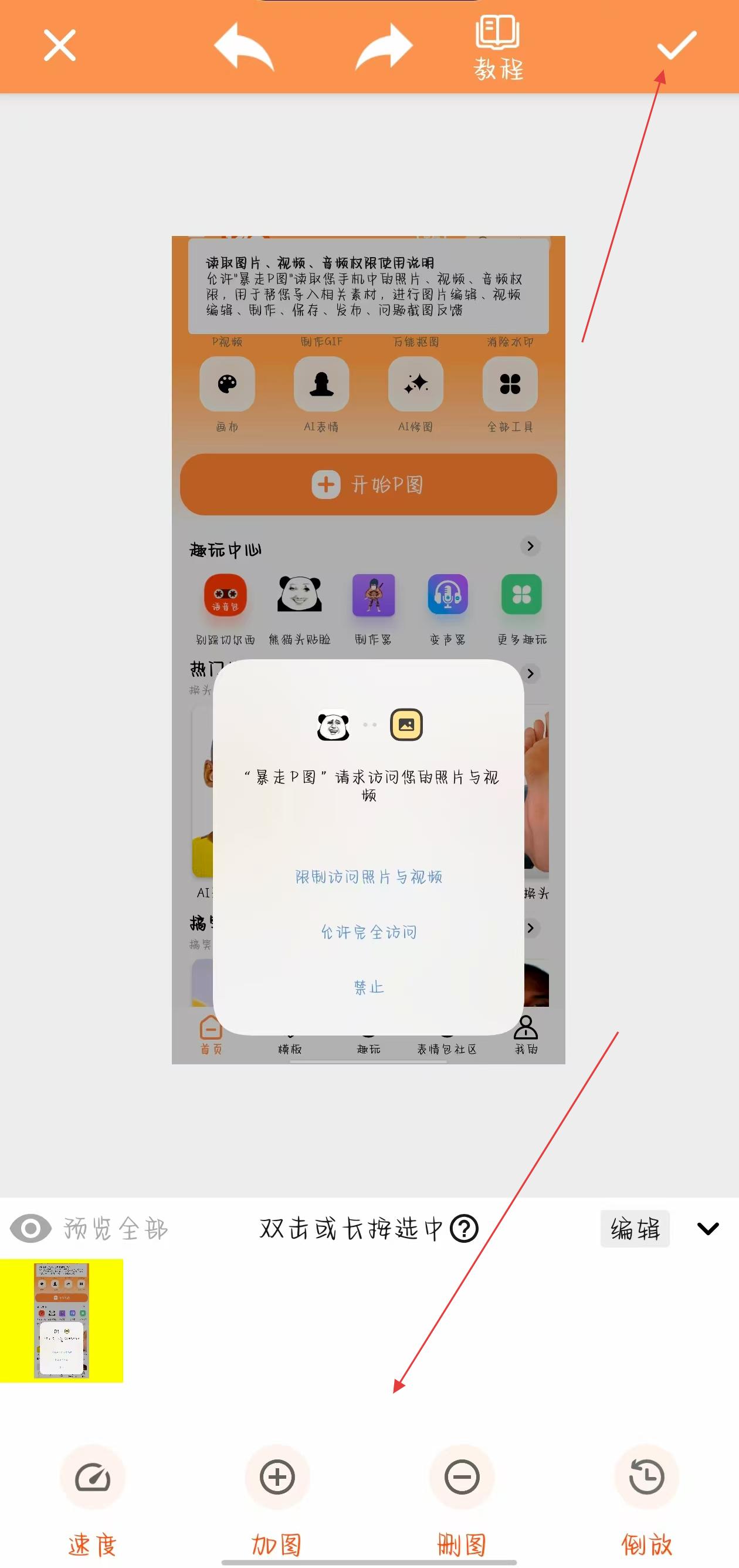 3、進入GIF編輯界面,根據(jù)需求調(diào)整GIF的播放速度、添加或刪除圖片、設(shè)置倒放效果等,編輯完成后,點擊界面右上角的對勾按鈕,即可完成GIF制作。