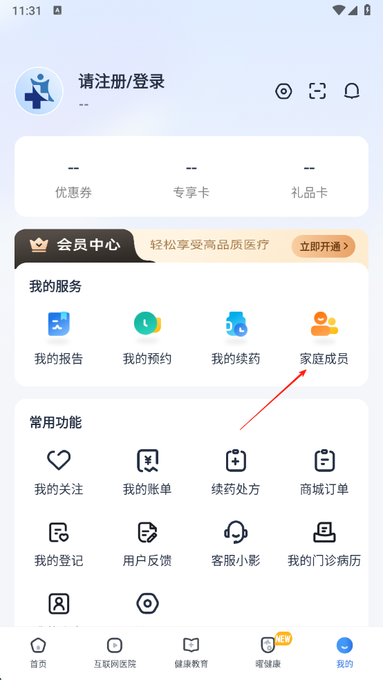 1、打開(kāi)醫(yī)療APP進(jìn)入首頁(yè),找到底部導(dǎo)航欄我的選項(xiàng)點(diǎn)擊,跳轉(zhuǎn)頁(yè)面后在我的服務(wù)區(qū)域,尋找家庭成員功能入口并點(diǎn)擊進(jìn)入。