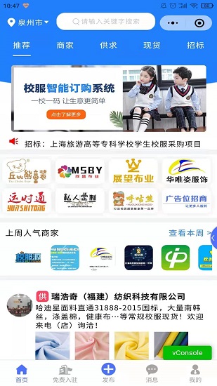 5、校服源供應(yīng)鏈平臺(tái)已有多家園服 、校服、加工廠、輔料商行、產(chǎn)品檢測(cè)機(jī)構(gòu)、物流等商家入駐。