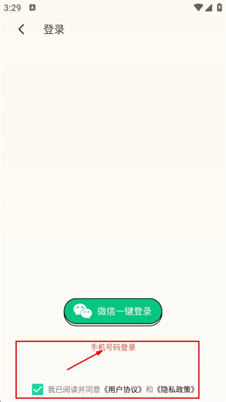 3、進(jìn)入登錄頁面,點(diǎn)擊“手機(jī)號(hào)碼登錄”選項(xiàng),勾選同意協(xié)議。