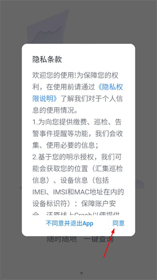 1、打開軟件后彈出隱私條款彈窗,點擊同意按鈕,跳轉(zhuǎn)至登錄頁面。