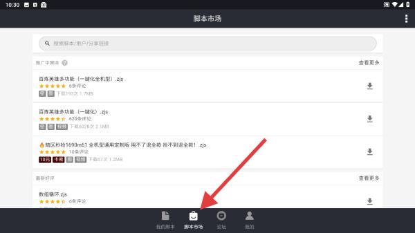 1、打開自動(dòng)精靈APP,點(diǎn)擊底部腳本市場(chǎng)入口;在頂部搜索欄輸入TT涂鴉、三角墻、火焰一線等關(guān)鍵詞。