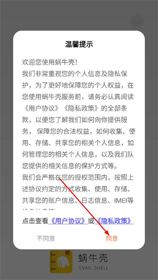 1、打開蝸牛殼,在彈出的提示頁面中,點擊同意。