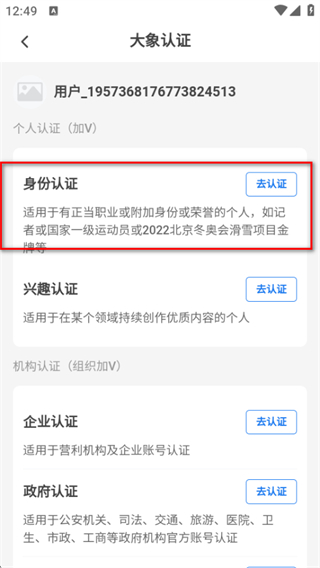 3、在大象認證界面點擊身份認證后的去認證,進入身份認證頁面。