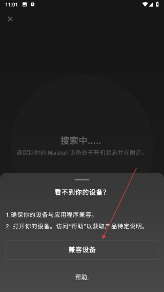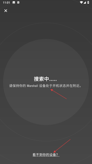 2、點(diǎn)擊之后,應(yīng)用將自動(dòng)搜索附近處于配對(duì)狀態(tài)的Marshall設(shè)備,若搜索不到設(shè)備,可點(diǎn)擊看不到你的設(shè)備。
