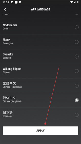 3、點(diǎn)擊簡(jiǎn)體中文選項(xiàng),點(diǎn)擊下方的APPLY。