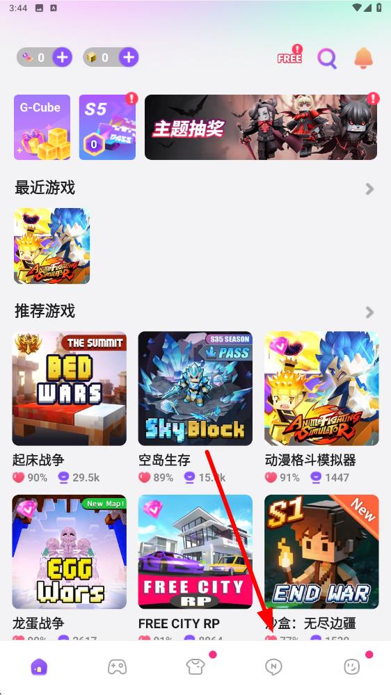 1、打開方塊堡壘游戲,進(jìn)入游戲主界面后,點(diǎn)擊底部導(dǎo)航欄中的圖標(biāo),進(jìn)入社交相關(guān)界面。
