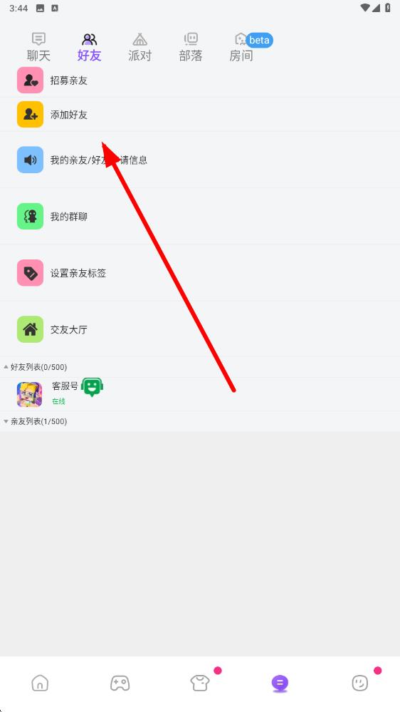 2、在社交界面里,選擇好友選項(xiàng)卡,然后點(diǎn)擊添加好友按鈕,進(jìn)入添加好友的操作頁面。