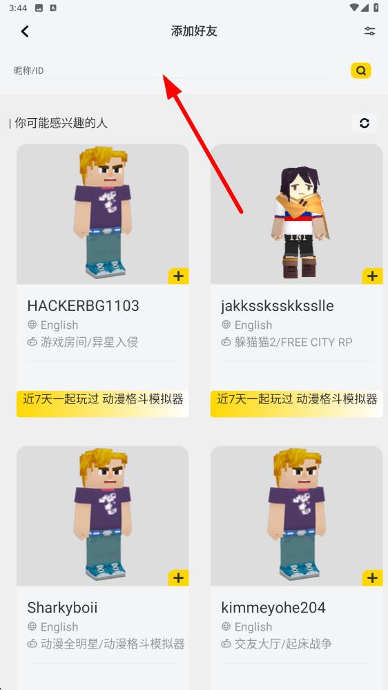 3、在添加好友頁面中,你可以在搜索框內(nèi),輸入你想添加好友的昵稱或ID,點(diǎn)擊搜索圖標(biāo),找到目標(biāo)好友后點(diǎn)擊發(fā)送好友申請(qǐng)。