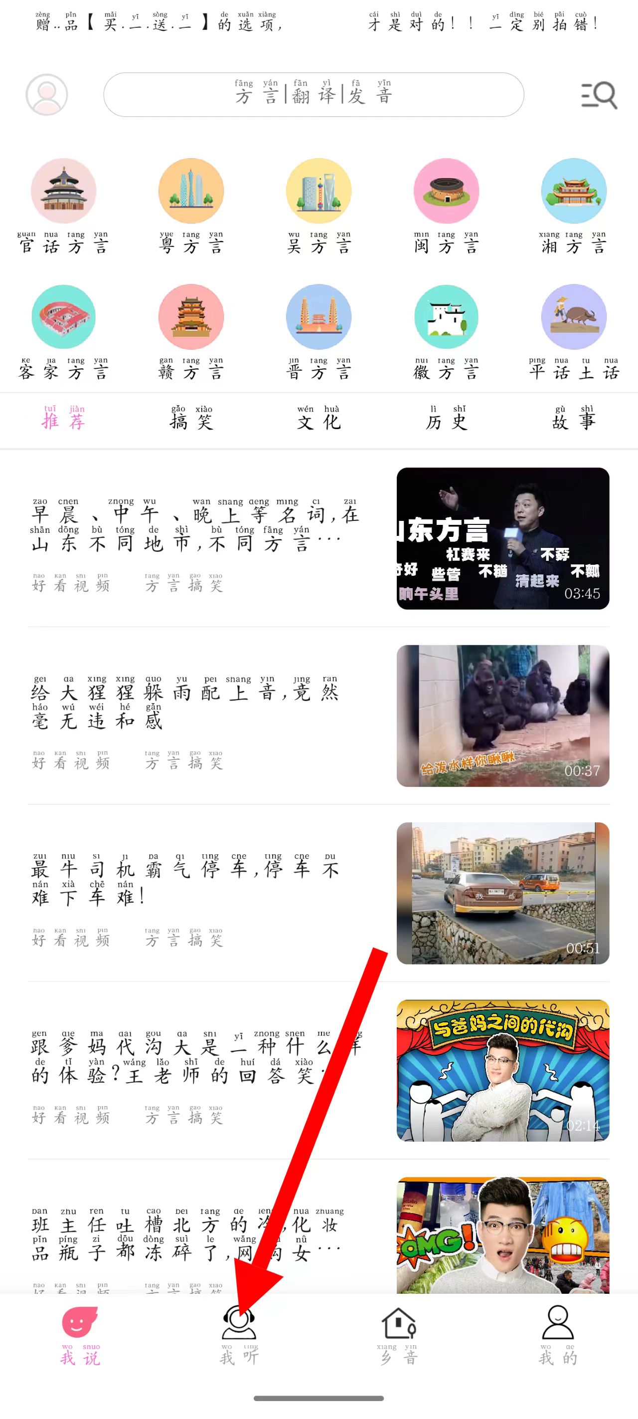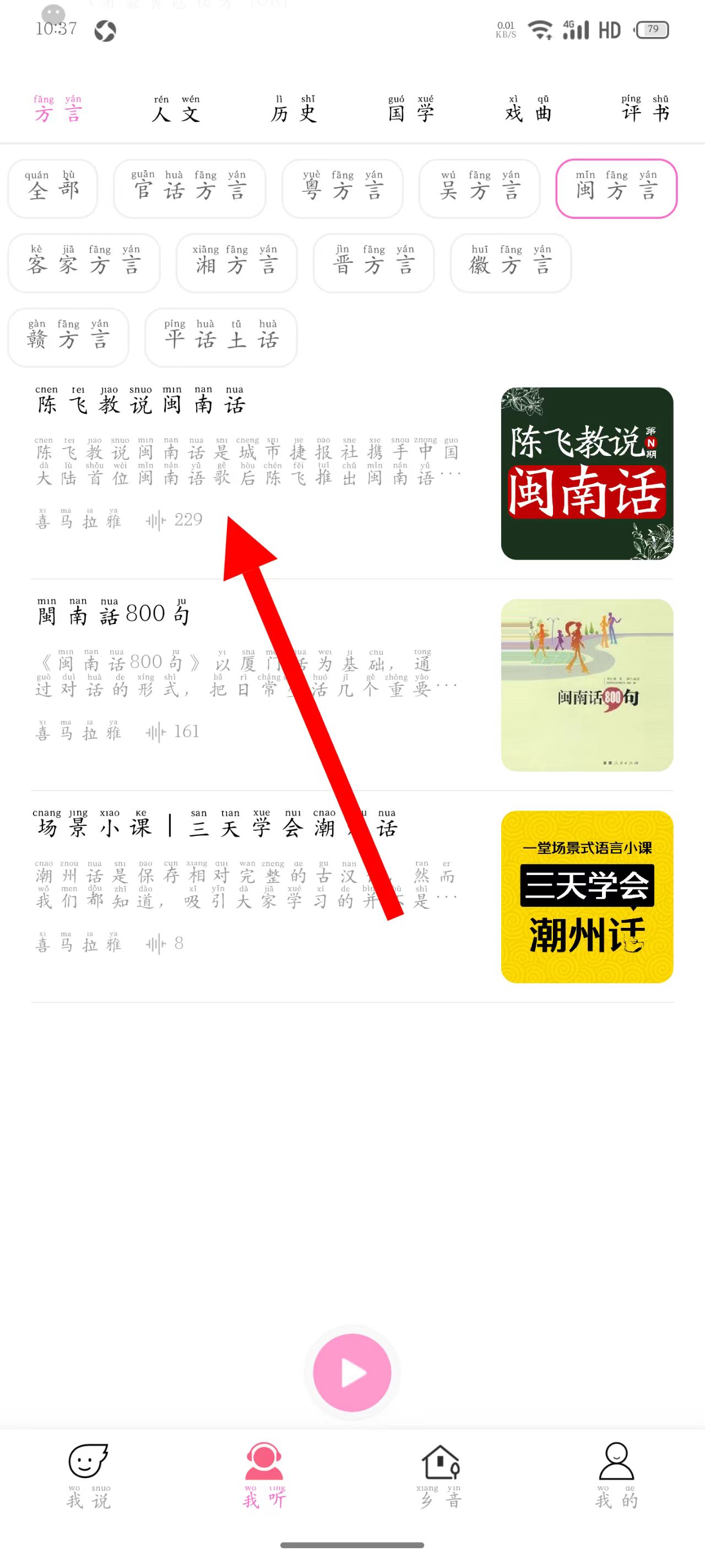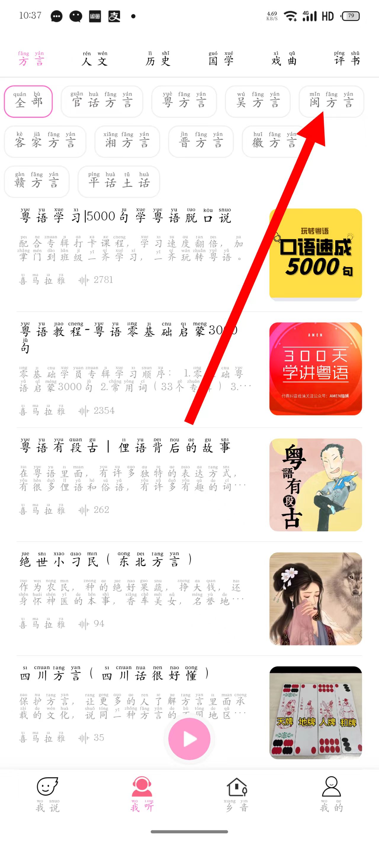 2、在我聽界面,找到并點(diǎn)擊閩方言選項(xiàng),進(jìn)入閩方言相關(guān)內(nèi)容頁面。