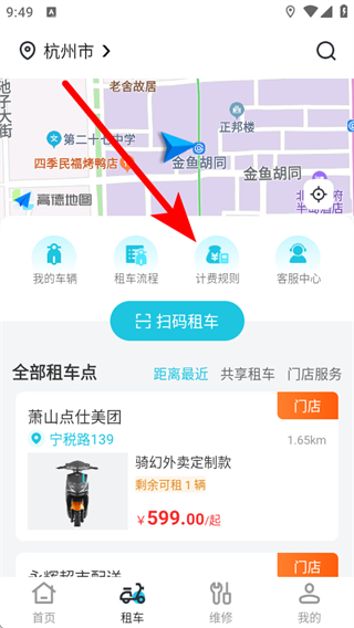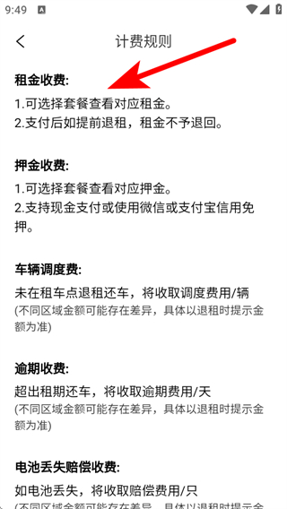 2、在租車頁面中,點擊計費規(guī)則選項,進入計費規(guī)則說明頁面。