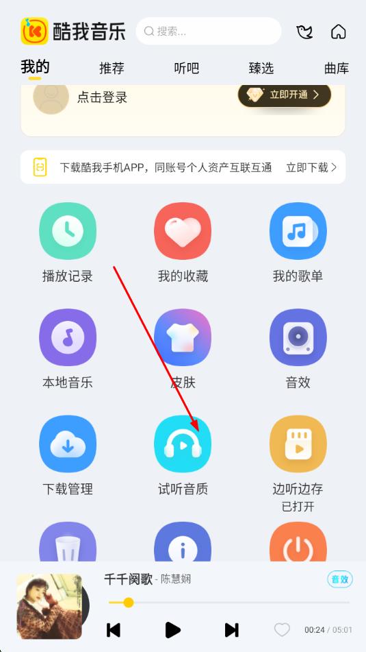 2、在“我的”頁面里,找到并點擊試聽音質(zhì)圖標。