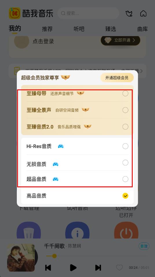 3、在彈出的音質(zhì)選擇窗口中,會顯示多種音質(zhì)選項,根據(jù)需求和會員權(quán)限,選擇音質(zhì)選項。