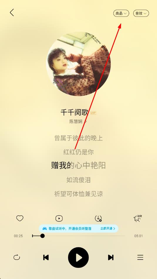 4、設置完成后,播放歌曲時,點擊歌曲播放頁面右上角的高品按鈕,可查看當前音質(zhì)設置。