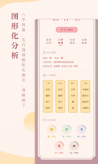 根據(jù)出生時辰,生成八字命理、八字排盤、五行旺弱圖形化數(shù)據(jù),清晰明了。通過八字分析,為你增補五行。