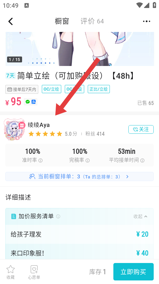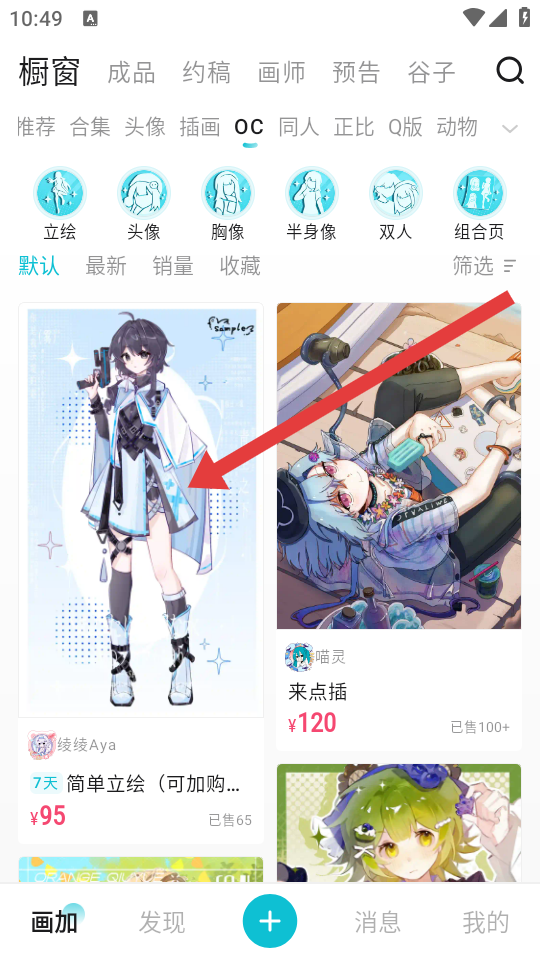 1、進入畫加APP的櫥窗頁面,找到目標畫師的作品卡片,點擊進入這個作者作品的詳情頁。