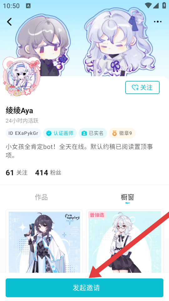 3、在畫師個人主頁底部,點擊發(fā)起邀請按鈕,即可打開私信窗口,與畫師溝通約稿或其他問題。