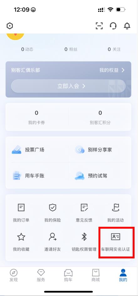 2、在我的頁(yè)面中,下滑找到并點(diǎn)擊車聯(lián)網(wǎng)實(shí)名認(rèn)證按鈕。