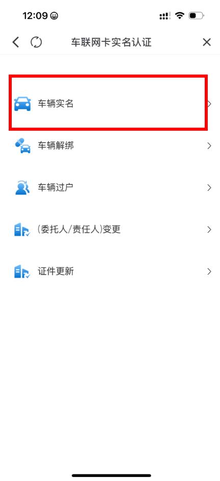 3、進(jìn)入車聯(lián)網(wǎng)卡實(shí)名認(rèn)證界面后,點(diǎn)擊車輛實(shí)名選項(xiàng)。
