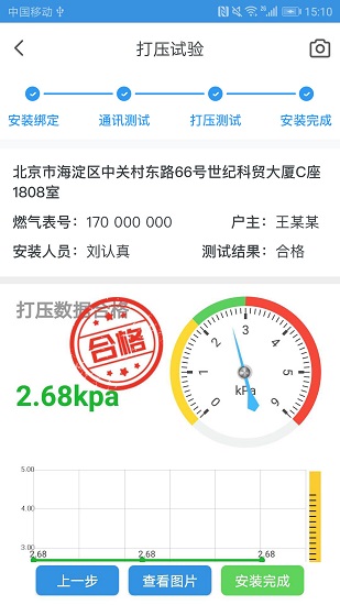 4.服務(wù)平臺將工作任務(wù)下發(fā)給安裝燃?xì)獗砉と?,工人可以根具任?wù)單到具體的地點安裝智能燃?xì)獗怼鹘y(tǒng)的燃?xì)獗硇枰と耸褂闷渌o助工具去測量燃?xì)鈮毫?,智能燃?xì)獗戆惭b完成后只需要在手機(jī)一鍵操作就可以進(jìn)行壓力計量。并且告知工人壓力是否在合格范圍內(nèi)。將現(xiàn)場拍照上傳即可完成安裝任務(wù)。效率高,方便快捷就是我們的目標(biāo)。