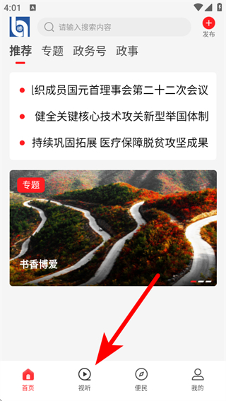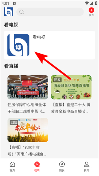 1、打開云上博愛APP首頁,點(diǎn)擊底部視聽,進(jìn)入視聽板塊的頁面。