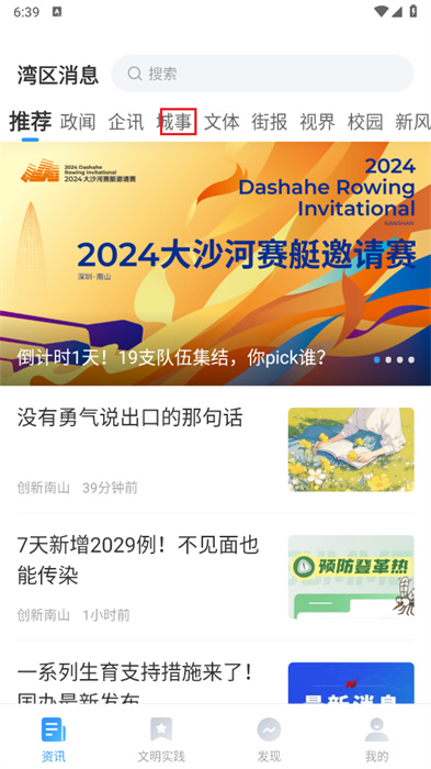 1、進(jìn)入應(yīng)用之中后,可以進(jìn)行各種不同欄目消息的查看,如可以點(diǎn)擊【城事】欄目,以進(jìn)行城事消息的查看;