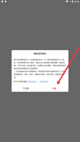 1、打開應(yīng)用時(shí),彈出隱私保護(hù)提示,閱讀《隱私政策》《用戶協(xié)議》后,點(diǎn)擊同意按鈕,方可進(jìn)入應(yīng)用主界面使用功能。